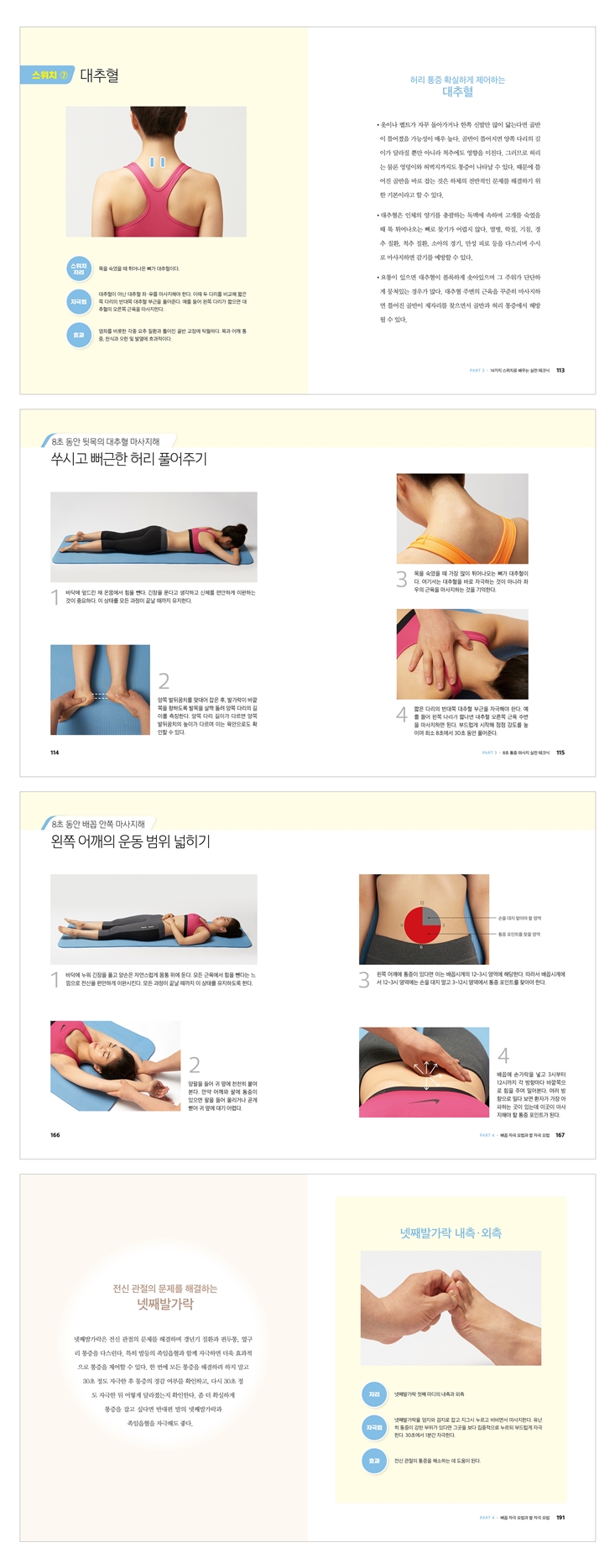 ¾ÆÇ ºÎÀ§¸¦ Á÷Á¢ ¸¶»çÁöÇÏÁö ¾Ê´Â´Ù. ¹«¸ÀÌ ¾ÆÇÁ¸é ¾ûµ¢ÀÌ, Ç㸮°¡ ¾ÆÇÁ¸é Á¾¾Æ¸®ÀÇ Æ¯Á¤ ÁöÁ¡À» ÀÚ±ØÇÏ´Â ½ÄÀ¸·Î °¢ ½Åü ºÎÀ§¿Í ¿¬°üµÈ ½ºÀ§Ä¡(°æÇ÷)¸¦ ã¾Æ ¸¶»çÁöÇÏ´Â °ÍÀÌ Æ¯Â¡ÀÌ´Ù. ÀδçÇ÷?žçÇ÷?Á°ñ°áÀý µî 14°¡Áö ½ºÀ§Ä¡¸¸ Á¦´ë·Î ¾Ë¾Æµµ Àϻ󿡼 °Þ±â ½¬¿î ÁÖ¿ä ºÎÀ§ÀÇ ÅëÁõÀ» ÃæºÐÈ÷ °æ°¨½Ãų ¼ö ÀÖ´Ù.