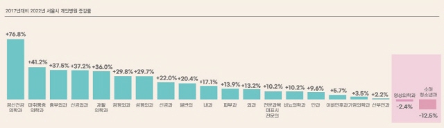 서울연구원이 최근 공개한 2022년 서울시 개인병원 현황 조사에서 최근 5년간 가장 많이 줄어든 진료 과목은 소아청소년과로 나타났다. 소아청소년과는 2017년 521개에서 2022년 456개로 12.5% 감소했다. 같은 기간 정신건강의학과가 76.8%, 마취통증의학과는 41.2%, 흉부외과는 37.5% 증가한 것과 대조적이다.